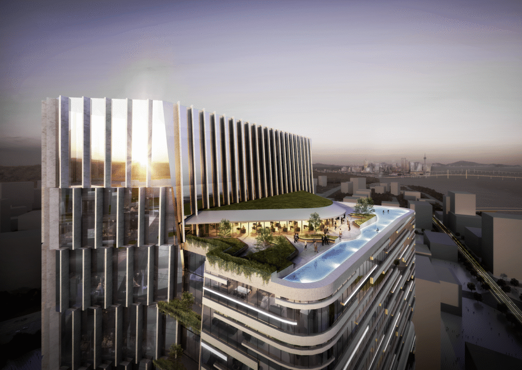 - The North façade, oriented toward office spaces, adopts a more restrained configuration to control solar gain from the west while preserving views of Macau and Shizimen’s skyline through a distinctive zig-zag geometry.