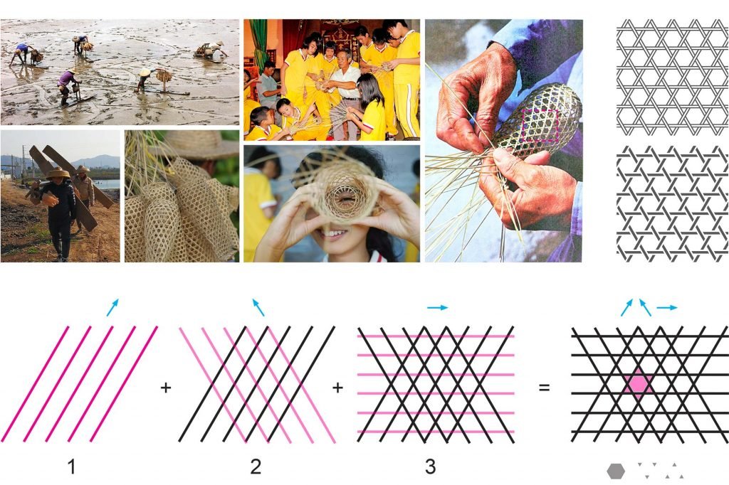 The mud-fish traps are constructed by interweaving two diagonal fibers with a third horizontal one, creating a distinctive pattern of hexagons and triangles. This elegant geometry became the foundation of the entire design. The grid defines not only the master plan layout but also guides the footprint of each unit, the landscape composition, and the elevated platforms that weave the project together.