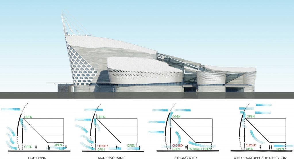 The Theater Building—the complex’s centerpiece—features a second-skin facade, reinterpreting the woven net pattern as an architectural screen. This layer not only reinforces the cultural narrative but also performs a crucial environmental function: the south-east facade shields the interior from strong winds and storms, while the north-facing sides remain open, transparent, and therefore, naturally ventilated toward the central plaza.