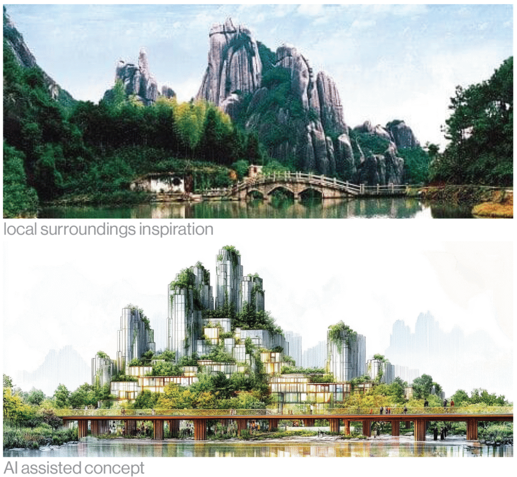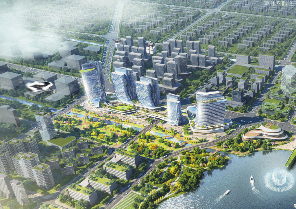 To reinforce this vision, we used AI-assisted design tools to reinterpret Taizhou’s geography—bridges, waterways, and mountains—into a contemporary architectural form. The result is a high-tech district shaped by green terraces, elevated pathways, and sculptural towers rising like peaks along the edge of Yunhu Lake.
